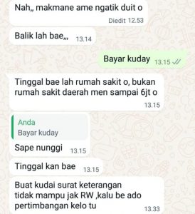 ” Balek lah bae, Tingalkan bae rumah sakit o, bukan rumah sakit daerah man sampai 6 juta o.” Tulis korban melalui pesan whatsapp